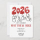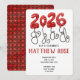 Retro balloon letters celebrate the graduate. Original balloon illustration by KG Nowak. Red, white, and black color palette. Classic graduation invitation. Enclose a separate senior photo.