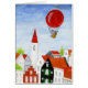 Love Mouse floating in her hot air balloon above the rooftops of a town. Fragment of Balloon Mouse & Roofs painting by s t u d i o L e n n A r t. www.studiolennart.com