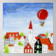 Mouse floating in her hot air balloon above the rooftops of a town. Fragment of Balloon Mouse & Roofs painting by s t u d i o L e n n A r t www.studiolennart.com