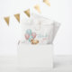 A cute and charming baby shower party favour bag featuring an adorable watercolor teddy bear with a pink bow, holding a mix of pink and blue balloons on the left side. Next to the bear is a blue present box. To the right, "Thank You!" is written in a playful mix of pink and blue script calligraphy. Below the message, the mother's name and the baby shower date are displayed. The design has a simple and minimal feel with grey text in a mix of serif font and script typography, creating an elegant and sweet look. You can customise the font and background colours to match your baby shower theme. Perfect for a gender neutral or surprise gender celebration. Personalised Elegant Watercolor Bear and Balloons Baby Shower Theme Thank You Party Favour Bag.
