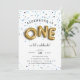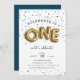 Adorable party invitation's for your little one's first birthday feature "ONE" spelled out in gold balloons, on a background of blue confetti. Personalise with your first birthday party details in a combo of whimsical and modern lettering. Invitations reverse to solid marine blue.