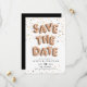 Unique wedding save the date cards feature "SAVE THE DATE" spelled out in rose gold balloons, on a background of rose gold, gold and black confetti. Personalise with your wedding details beneath, including date, location and your wedding website, or an indication that a formal invitation will follow. Cards reverse to solid black.