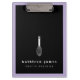 Modern clipboard in a cute design for your catering business, cafe, bakery, or similar. On a black background and framed by a lavender purple border, a cute balloon whisk in white with a heart on the handle. Add your name or business name in bold white letters above your tagline.