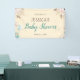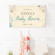 This elegant baby shower banner features soft flowers accented with greenery and feathers. Another graphic in the lower left corner features gift boxes with balloons. The banner offers many colours which make is perfect for a gender neutral baby shower.