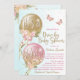 Girl Covid baby shower invitation with pretty pink and gold balloons with flowers, butterflies and bows on a teal blue and white background. This cute pink, gold and teal blue drive by baby shower invitation is easily customised with your event details.
