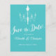Ballroom chandelier wedding save the date card. Pretty simple and elegant white hanging chandelier set against aqua turquoise background. This wedding save the date matches with our chandelier wedding suite collection.