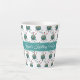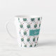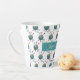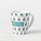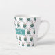 Knitting yarn and needles pattern mug with place to personalise with a name. Sample text is “{Name} knitting mug” in white script over sea blue-green colour panel in the centre of a white mug. Two knitting needles stuck into a ball of variegated blue yarn make a fun pattern around the little mug for coffee or tea.