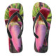 The artwork on these Flip Flops is an original photograph by MaeFlowers of a flowering banana tree. The photo is a closeup, showing the amazing banana flower opening and curling back to reveal the tiny developing bananas. They are pale yellow in colour, tucked between the reddish brown petals of the flower. The older bananas line up in pale green bunches above the flower. Other tropical vegetation makes up the soft focus background.