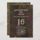 Birthday party invitation template with a guitar design and music theme. Dark brown, distressed background and grunge fonts with his age in centre. Grey text has party title at top with party information in a paragraph to hold all your wording. This design also comes as an instant download.