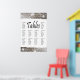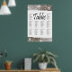 Background image of old wood. Keep track of table assignments--insert names by table, or alphabetically. Room for 100 names. Use "customise" option if you need to change spacing. NOTE: When you insert your names, they will not line up evenly (because of differences in name length). To align them, click the customise button. You will see a list on the right. Hold down the ctrl key while clicking each name in the group you wish to align. Once they are all selected, click Arrange. Then click Align Selected. Then choose the image labelled "left." This will give your selected group a straight left-side alignment. While the names are still selected, you can then drag and drop the box on the design page if you want to move the whole block of names.