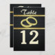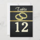 Black and gold elegance! The small circular, embossed pattern and two gold horizontal bands are the background for the featured wedding bands on these table number cards.