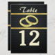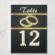 Black and gold elegance! The small circular, embossed pattern and two gold horizontal bands are the background for the featured wedding bands on these table number cards.