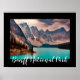Beautiful scenic photograph of Moraine Lake, Banff National Park, Alberta, Canada. Black border with white text overlay