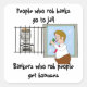 "People who rob banks go to jail. Bankers who rob people get bonuses." This is the statement made here as more and more people are fed up with bailouts and greedy corporate behaviour in general. Graphic shows a bank robber behind bars next to a chubby white shirt and tie banker licking a thick wad of cash.