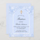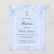 A light blue background and an arch frame. Decorated with light blue confetti. Personalise and a name and ceremony details. Elegant hand lettered style script.