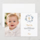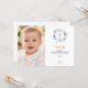 A modern and elegant baptism thank you card. A chic white background decorated with a watercolored blue floral wreath, a bow and a golden cross. Personalise and add your photo of the child, thank you note and name.