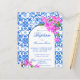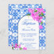 Blue Tiles and Bougainvillea elegant Mediterranean Greek Santorini Mykonos themed baby christening baptism budget invitation template.