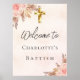 A rose gold gradient background decorated with golden cross, pampas grass and blush pink flowers. Personalise and add a name. Back: no design