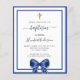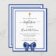 A modern, elegant and baptism invitation. A white background decorated with royal blue frames and bow. Personalise and add a name and details. Black coloured letters.