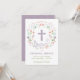 This elegant and pretty baptism, christening invitation features an illustrated floral wreath with the word "Baptism" encircling a cross. The text colour, font and message can be changed to your liking. The back of the invite features a purple background (that can be swapped to any colour of your choice) with a white quatrefoil pattern.