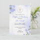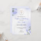 A baptism and christening invitation with a floral design. Features delicate purple and green leaves, a gold cross, and elegant script text.