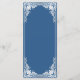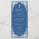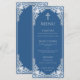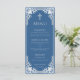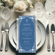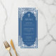 The menu has a vintage faux silver frame. Above the text, there is a faux silver cross. The title "Menu" and the subtitles are written in caps. All text can be personalised and has a grey colour similar to the frame. The background is classic blue. On the back, there is the same vintage frame.