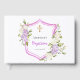 A white background. Decorated with a pink crest, pink and purple flowers, florals. With a golden cross.