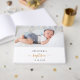 For an elegant baptism, gender neutral. A chic white background. Personalise and add a landscape sized photo on the front, the name of the child and the date of the baptism. Black and golden letters.