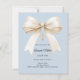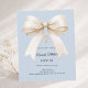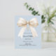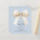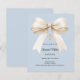 Celebrate his special day with this elegant dusty blue baptism invitation featuring a soft ivory satin bow and delicate gold cross detail.