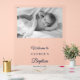 Elegant Baptism event welcome sign in navy blue with gold floral details. It is personalised with your custom photo. Find matching products in our shop or contact us.