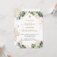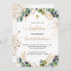 A white background decorated with eucalyptus greenery and golden leaves and faux gold glitter drops. Personalise and the childs name and ceremony details. Black and golden coloured letters.