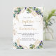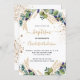 A white background decorated with eucalyptus greenery and golden leaves and faux gold glitter drops. Personalise and the childs name and ceremony details. Black and golden coloured letters.
