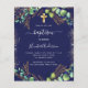 A navy blue background decorated with eucalyptus greenery and golden leaves and faux gold glitter sparkles. A golden cross. Personalise and the child's name and ceremony details.