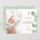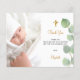 A modern and elegant baptism thank you card. A chic white background decorated with eucalyptus greenery. Personalise and add your photo of the child, thank you note and name. Gender neutral.