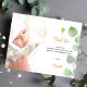 A modern and elegant baptism thank you note. A chic white background decorated with eucalyptus greenery. Personalise and add your photo of the child, thank you note and name. Gender neutral.