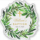 This botanical , gender neutral design for a baptism has a foliage frame of green leaves. Inside the greenery frame, above the text, there is a faux gold foil cross. The name and occasion are golden, the date is black. The name is written in an elegant calligraphic script.