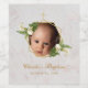This elegant floral baptism design has a replaceable baby photo in an irregular gold frame from two gold hexagons that overlay, with a gold cross at its top and with flower bouquets of calla lilies on the frame, up left and down right. Under the frame, the name and occasion are written in an elegant calligraphic script, the date in caps. All text is golden. The background is white marble.