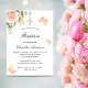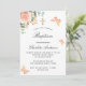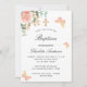 A white background decorated with eucalyptus greenery, a rose gold and blush pink rose, golden leaves and butterflies. Personalise and the childs name and ceremony details.