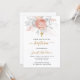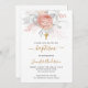 For an elegant baptism, celebrating a baby girl. A chic white background. Decorated with rose gold and white florals, roses and a faux gold cross. Personalise and add the name of the child and details. Black and golden letters.