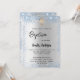 A modern, elegant baptism, celebrating a baby boy.  Faux silver metallic looking background decorated with blue faux glitter, sparkles and a golden cross. Personalise and add a name and party details. Black coloured letters.