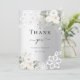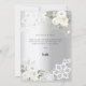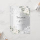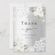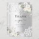 A modern and elegant gender neutral baptism thank you card. A faux silver looking background. Decorated with white roses, florals flowers, lace and a small cross.