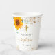 For an elegant baptism, gender neutral. A chic white background. Decorated with rustic watercolored sunflowers, eucalyptus greenery leaves, sprigs, greenery, faux gold leaves. A faux gold cross. Personalise and add the name of the child and a date. Black and golden letters.