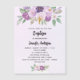 A violet, lavender watercolored background. Decorated with violet and purple watercolored flowers and greenery and a golden cross. Personalise and add a name and reception details.