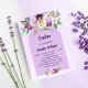 A violet, lavender watercolored background. Decorated with violet and purple watercolored flowers and a golden cross. Personalise and the name and reception details.