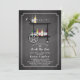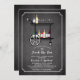 Modern Bar Cart Stock the Bar Couples Shower Invitation featuring a stylish bar cart with liquor & wine bottles & drink glasses set on a popular black chalkboard background with a matching backside.