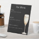 With the text: Open bar. Personalise and add your bar menu. Black background. Decorated with a glass, flute of sparkling wine.
