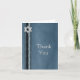 Stylish Bar Mitzvah thank you card with silver Star of David and side stripes in shades of blue on aged-look blue background.