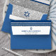 When you send out this cool, unique, modern, personalised coordinating Bar Mitzvah invitation envelope you’ll definitely stand out in the daily mail. The outside back flap of this blue and white envelope boasts bold, navy blue typography and Star of David, sans serif grey typography and a navy blue and faux silver glitter striped tallit inspired graphic. The inside lining finds a surprise visual of a bold, navy blue Star of David overlaying faux silver glitter. Personalise the return address with your Bar Mitzvah’s information. Matching and coordinating invites, thank you notes, banners, stickers and other Bar Mitzvah goodies are also available in this trendy and special collection.