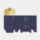 The rest is navy blue, with golden text on the front: in the lower part, the name in an elegant calligraphy, the occasion and the date. In the upper part, under the flap, there is the message "Thank You" in the same golden script.