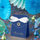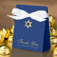 A blue and gold favor box for a boy's bar mitzvah. On the flap, it has faux gold foil star of David.